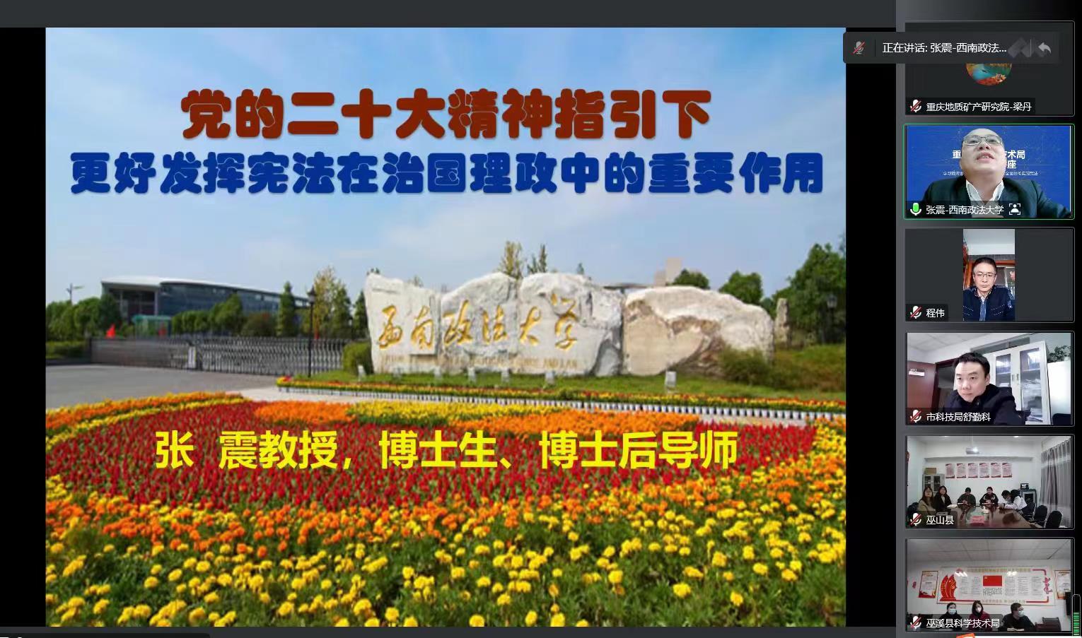 12月4日第九个国家宪法日,市科技局举行“宪法宣传周”启动活动。市深学笃用习近平法治思想宣讲团专家、西南政法大学行政法学院张震教授以视频方式作题为“深入学习宣传贯彻党的二十大精神,推动全面贯彻实施宪法”宣传讲座。市科技局党委副书记程伟主持讲座。全市各高校、科研院所、科技型企业、新型研发机构负责人,高新园区、高新技术联盟等创新主体和平台有关科技工作者,市、区(县)两级科技行政管理部门负责人在线参加活动。