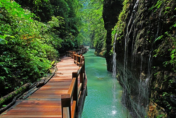 黑山谷景区是国家5A级景区,位于万盛经开区黑山镇,距离万盛城区20公里。景区全长13公里,主要景点有“一岛、三谷、五峡、七区、十二峰、三十六桥、九十九瀑、一百零八潭”等。景观价值集“山水泉林洞”于一体,融“奇险峻秀幽”于一身,尤以秀瀑、浮桥、渝黔大裂谷最为出名。这里山高林密、溪河纵横、人迹罕至,保存着地球上同纬度为数不多的亚热带和温带完好的自然生态,谷内森林覆盖率达97%,以黑叶猴、珙桐为代表的珍稀动植物种类繁多,已发现植物1800多种、脊椎动物300多种,被誉为“渝黔生物基因库”。谷中负氧离子浓度高达11万个/立方厘米以上,空气清洁度超过国家一级标准,如同一个天然大氧吧。十里青翠,满谷富氧,被誉为“中国最美养生峡谷”。黑山谷景区多次蝉联“巴渝十二景”。