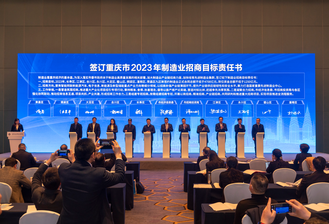 市招商投资局、市经济信息委与长寿区、江津区、合川区、永川区、大足区、璧山区、铜梁区、潼南区、荣昌区政府分管负责人签订2023年制造业招商目标责任书。